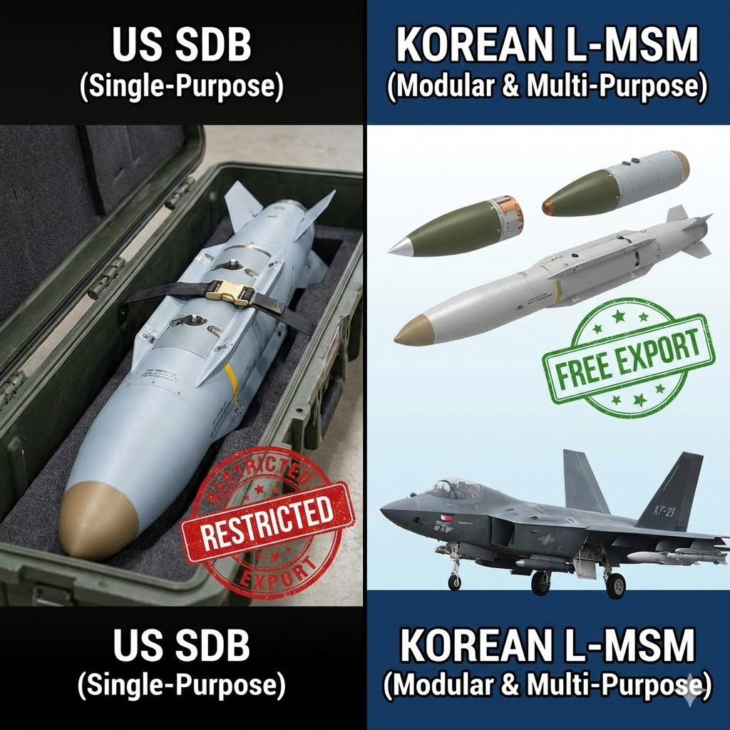 가장 큰 차이점은 '모듈형 설계'입니다. 미국산 SDB는 단일 목적의 폭탄이지만, 국산 L-MSM은 탄두를 마치 레고 블록처럼 갈아 끼울 수 있습니다. 상황에 따라 벙커를 뚫는 관통탄이 되기도 하고, 넓은 지역을 제압하는 파편탄이 되기도 합니다. 투자자 여러분의 이해를 돕기 위해 핵심 차이를 표로 정리했습니다.